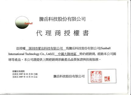 深圳市爱法科技有限公司取得台湾腾岳科技股份有限公司的最新代理授权书,为客户提供正品台湾上博(SUNBALL)高品质BGA锡球和技术服务,价格优惠,欢迎新老客户联系订购。